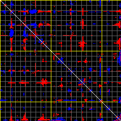 This matrix displays the maximum distance fluctuations between all pairs of CA atoms and between the two extreme conformations that were computed for this mode (DQMIN/DQMAX). Distance increases are plotted in blue and decreases in red for the strongest 10% of the residue pair distance changes. Every pixel corresponds to a single residue. Grey lines are drawn every 10 residues, yellow lines every 100 residues (counting from the upper left corner).