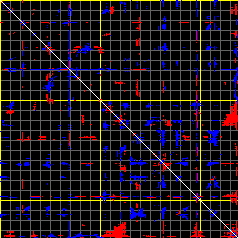 This matrix displays the maximum distance fluctuations between all pairs of CA atoms and between the two extreme conformations that were computed for this mode (DQMIN/DQMAX). Distance increases are plotted in blue and decreases in red for the strongest 10% of the residue pair distance changes. Every pixel corresponds to a single residue. Grey lines are drawn every 10 residues, yellow lines every 100 residues (counting from the upper left corner).