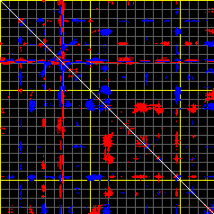 This matrix displays the maximum distance fluctuations between all pairs of CA atoms and between the two extreme conformations that were computed for this mode (DQMIN/DQMAX). Distance increases are plotted in blue and decreases in red for the strongest 10% of the residue pair distance changes. Every pixel corresponds to a single residue. Grey lines are drawn every 10 residues, yellow lines every 100 residues (counting from the upper left corner).