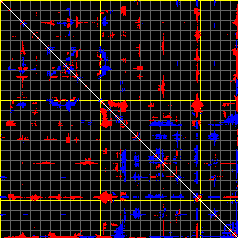 This matrix displays the maximum distance fluctuations between all pairs of CA atoms and between the two extreme conformations that were computed for this mode (DQMIN/DQMAX). Distance increases are plotted in blue and decreases in red for the strongest 10% of the residue pair distance changes. Every pixel corresponds to a single residue. Grey lines are drawn every 10 residues, yellow lines every 100 residues (counting from the upper left corner).