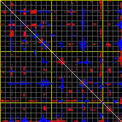 This matrix displays the maximum distance fluctuations between all pairs of CA atoms and between the two extreme conformations that were computed for this mode (DQMIN/DQMAX). Distance increases are plotted in blue and decreases in red for the strongest 10% of the residue pair distance changes. Every pixel corresponds to a single residue. Grey lines are drawn every 10 residues, yellow lines every 100 residues (counting from the upper left corner).
