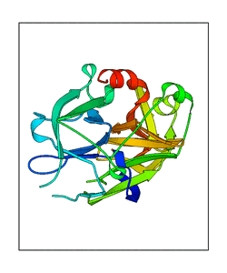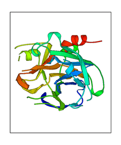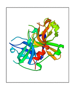 These views are prepared from three orthologuous viewpoints with MolScript. Secondary structures are determined from the C-alpha atom positions of your protein (N-terminal blue, C-terminal red).