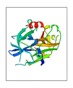 These views are prepared from three orthologuous viewpoints with MolScript. Secondary structures are determined from the C-alpha atom positions of your protein (N-terminal blue, C-terminal red).