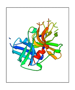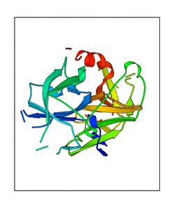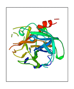 These views are prepared from three orthologuous viewpoints with MolScript. Secondary structures are determined from the C-alpha atom positions of your protein (N-terminal blue, C-terminal red).