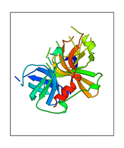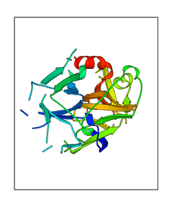 These views are prepared from three orthologuous viewpoints with MolScript. Secondary structures are determined from the C-alpha atom positions of your protein (N-terminal blue, C-terminal red).