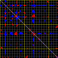 This matrix displays the maximum distance fluctuations between all pairs of CA atoms and between the two extreme conformations that were computed for this mode (DQMIN/DQMAX). Distance increases are plotted in blue and decreases in red for the strongest 10% of the residue pair distance changes. Every pixel corresponds to a single residue. Grey lines are drawn every 10 residues, yellow lines every 100 residues (counting from the upper left corner).