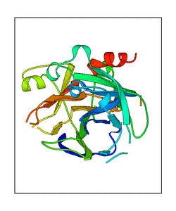 These views are prepared from three orthologuous viewpoints with MolScript. Secondary structures are determined from the C-alpha atom positions of your protein (N-terminal blue, C-terminal red).