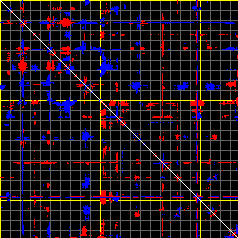 This matrix displays the maximum distance fluctuations between all pairs of CA atoms and between the two extreme conformations that were computed for this mode (DQMIN/DQMAX). Distance increases are plotted in blue and decreases in red for the strongest 10% of the residue pair distance changes. Every pixel corresponds to a single residue. Grey lines are drawn every 10 residues, yellow lines every 100 residues (counting from the upper left corner).