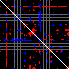 This matrix displays the maximum distance fluctuations between all pairs of CA atoms and between the two extreme conformations that were computed for this mode (DQMIN/DQMAX). Distance increases are plotted in blue and decreases in red for the strongest 10% of the residue pair distance changes. Every pixel corresponds to a single residue. Grey lines are drawn every 10 residues, yellow lines every 100 residues (counting from the upper left corner).