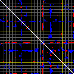 This matrix displays the maximum distance fluctuations between all pairs of CA atoms and between the two extreme conformations that were computed for this mode (DQMIN/DQMAX). Distance increases are plotted in blue and decreases in red for the strongest 10% of the residue pair distance changes. Every pixel corresponds to a single residue. Grey lines are drawn every 10 residues, yellow lines every 100 residues (counting from the upper left corner).