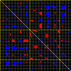 This matrix displays the maximum distance fluctuations between all pairs of CA atoms and between the two extreme conformations that were computed for this mode (DQMIN/DQMAX). Distance increases are plotted in blue and decreases in red for the strongest 10% of the residue pair distance changes. Every pixel corresponds to a single residue. Grey lines are drawn every 10 residues, yellow lines every 100 residues (counting from the upper left corner).