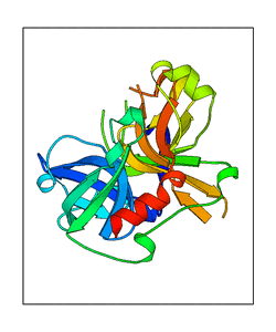 These views are prepared from three orthologuous viewpoints with MolScript. Secondary structures are determined from the C-alpha atom positions of your protein (N-terminal blue, C-terminal red).