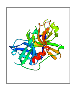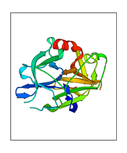 These views are prepared from three orthologuous viewpoints with MolScript. Secondary structures are determined from the C-alpha atom positions of your protein (N-terminal blue, C-terminal red).