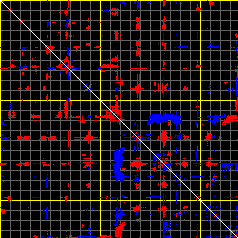 This matrix displays the maximum distance fluctuations between all pairs of CA atoms and between the two extreme conformations that were computed for this mode (DQMIN/DQMAX). Distance increases are plotted in blue and decreases in red for the strongest 10% of the residue pair distance changes. Every pixel corresponds to a single residue. Grey lines are drawn every 10 residues, yellow lines every 100 residues (counting from the upper left corner).