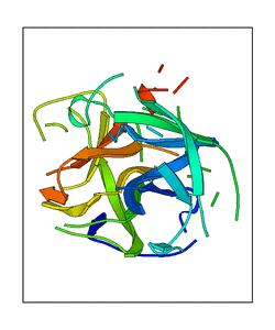 These views are prepared from three orthologuous viewpoints with MolScript. Secondary structures are determined from the C-alpha atom positions of your protein (N-terminal blue, C-terminal red).