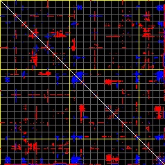 This matrix displays the maximum distance fluctuations between all pairs of CA atoms and between the two extreme conformations that were computed for this mode (DQMIN/DQMAX). Distance increases are plotted in blue and decreases in red for the strongest 10% of the residue pair distance changes. Every pixel corresponds to a single residue. Grey lines are drawn every 10 residues, yellow lines every 100 residues (counting from the upper left corner).