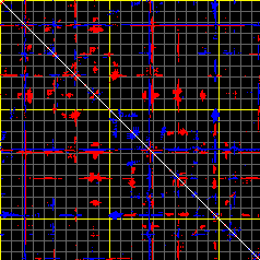 This matrix displays the maximum distance fluctuations between all pairs of CA atoms and between the two extreme conformations that were computed for this mode (DQMIN/DQMAX). Distance increases are plotted in blue and decreases in red for the strongest 10% of the residue pair distance changes. Every pixel corresponds to a single residue. Grey lines are drawn every 10 residues, yellow lines every 100 residues (counting from the upper left corner).