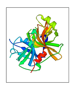 These views are prepared from three orthologuous viewpoints with MolScript. Secondary structures are determined from the C-alpha atom positions of your protein (N-terminal blue, C-terminal red).