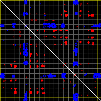 This matrix displays the maximum distance fluctuations between all pairs of CA atoms and between the two extreme conformations that were computed for this mode (DQMIN/DQMAX). Distance increases are plotted in blue and decreases in red for the strongest 10% of the residue pair distance changes. Every pixel corresponds to a single residue. Grey lines are drawn every 10 residues, yellow lines every 100 residues (counting from the upper left corner).