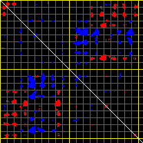 This matrix displays the maximum distance fluctuations between all pairs of CA atoms and between the two extreme conformations that were computed for this mode (DQMIN/DQMAX). Distance increases are plotted in blue and decreases in red for the strongest 10% of the residue pair distance changes. Every pixel corresponds to a single residue. Grey lines are drawn every 10 residues, yellow lines every 100 residues (counting from the upper left corner).