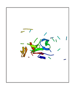 CAUTION: The amplitude range presented in these views corresponds to the highest (DQMAX) and lowest (DQMIN) perturbations chosen for this mode. Secondary structures can break down (and thus disappear from the animation) if the applied amplitudes are too large for Molscript to identify them. The choice of the amplitude is not a NMA result, but has to be done by the user on physical grounds. To change the amplitude range, you can recompute the animation of the desired mode by using the "Compute additional perturbed models with elNémo" section on the results page of your job.