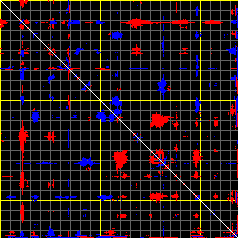 This matrix displays the maximum distance fluctuations between all pairs of CA atoms and between the two extreme conformations that were computed for this mode (DQMIN/DQMAX). Distance increases are plotted in blue and decreases in red for the strongest 10% of the residue pair distance changes. Every pixel corresponds to a single residue. Grey lines are drawn every 10 residues, yellow lines every 100 residues (counting from the upper left corner).
