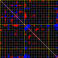 This matrix displays the maximum distance fluctuations between all pairs of CA atoms and between the two extreme conformations that were computed for this mode (DQMIN/DQMAX). Distance increases are plotted in blue and decreases in red for the strongest 10% of the residue pair distance changes. Every pixel corresponds to a single residue. Grey lines are drawn every 10 residues, yellow lines every 100 residues (counting from the upper left corner).
