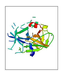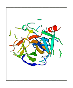 These views are prepared from three orthologuous viewpoints with MolScript. Secondary structures are determined from the C-alpha atom positions of your protein (N-terminal blue, C-terminal red).