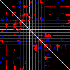 This matrix displays the maximum distance fluctuations between all pairs of CA atoms and between the two extreme conformations that were computed for this mode (DQMIN/DQMAX). Distance increases are plotted in blue and decreases in red for the strongest 10% of the residue pair distance changes. Every pixel corresponds to a single residue. Grey lines are drawn every 10 residues, yellow lines every 100 residues (counting from the upper left corner).