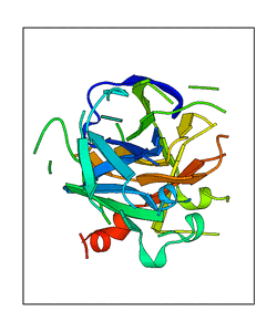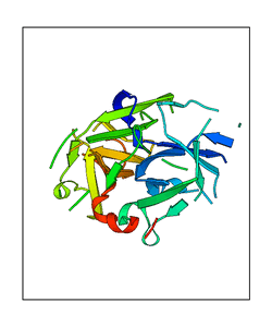These views are prepared from three orthologuous viewpoints with MolScript. Secondary structures are determined from the C-alpha atom positions of your protein (N-terminal blue, C-terminal red).