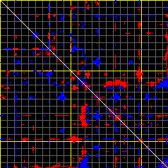 This matrix displays the maximum distance fluctuations between all pairs of CA atoms and between the two extreme conformations that were computed for this mode (DQMIN/DQMAX). Distance increases are plotted in blue and decreases in red for the strongest 10% of the residue pair distance changes. Every pixel corresponds to a single residue. Grey lines are drawn every 10 residues, yellow lines every 100 residues (counting from the upper left corner).