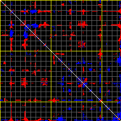 This matrix displays the maximum distance fluctuations between all pairs of CA atoms and between the two extreme conformations that were computed for this mode (DQMIN/DQMAX). Distance increases are plotted in blue and decreases in red for the strongest 10% of the residue pair distance changes. Every pixel corresponds to a single residue. Grey lines are drawn every 10 residues, yellow lines every 100 residues (counting from the upper left corner).