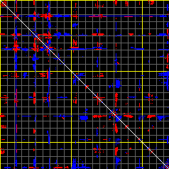 This matrix displays the maximum distance fluctuations between all pairs of CA atoms and between the two extreme conformations that were computed for this mode (DQMIN/DQMAX). Distance increases are plotted in blue and decreases in red for the strongest 10% of the residue pair distance changes. Every pixel corresponds to a single residue. Grey lines are drawn every 10 residues, yellow lines every 100 residues (counting from the upper left corner).