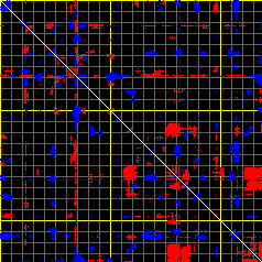 This matrix displays the maximum distance fluctuations between all pairs of CA atoms and between the two extreme conformations that were computed for this mode (DQMIN/DQMAX). Distance increases are plotted in blue and decreases in red for the strongest 10% of the residue pair distance changes. Every pixel corresponds to a single residue. Grey lines are drawn every 10 residues, yellow lines every 100 residues (counting from the upper left corner).