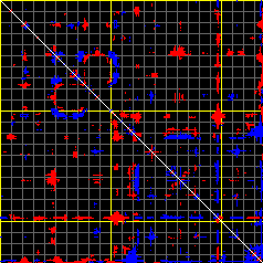This matrix displays the maximum distance fluctuations between all pairs of CA atoms and between the two extreme conformations that were computed for this mode (DQMIN/DQMAX). Distance increases are plotted in blue and decreases in red for the strongest 10% of the residue pair distance changes. Every pixel corresponds to a single residue. Grey lines are drawn every 10 residues, yellow lines every 100 residues (counting from the upper left corner).
