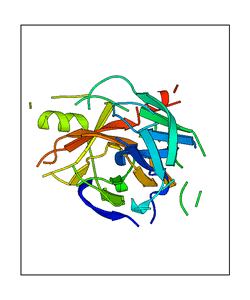 These views are prepared from three orthologuous viewpoints with MolScript. Secondary structures are determined from the C-alpha atom positions of your protein (N-terminal blue, C-terminal red).