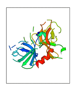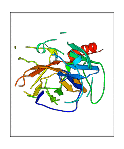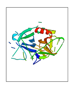 These views are prepared from three orthologuous viewpoints with MolScript. Secondary structures are determined from the C-alpha atom positions of your protein (N-terminal blue, C-terminal red).