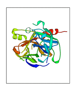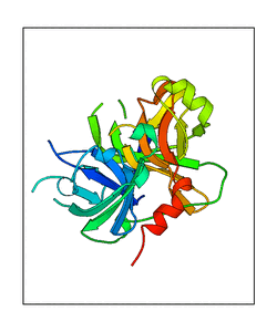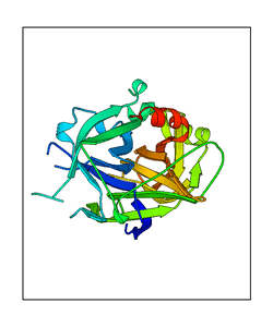 These views are prepared from three orthologuous viewpoints with MolScript. Secondary structures are determined from the C-alpha atom positions of your protein (N-terminal blue, C-terminal red).
