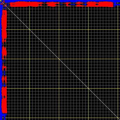 This matrix displays the maximum distance fluctuations between all pairs of CA atoms and between the two extreme conformations that were computed for this mode (DQMIN/DQMAX). Distance increases are plotted in blue and decreases in red for the strongest 10% of the residue pair distance changes. Every pixel corresponds to a single residue. Grey lines are drawn every 10 residues, yellow lines every 100 residues (counting from the upper left corner).