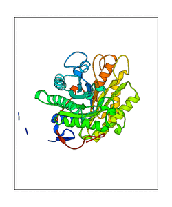 These views are prepared from three orthologuous viewpoints with MolScript. Secondary structures are determined from the C-alpha atom positions of your protein (N-terminal blue, C-terminal red).