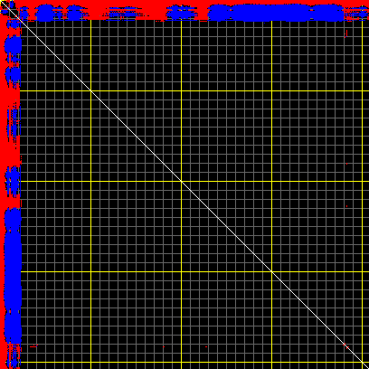 This matrix displays the maximum distance fluctuations between all pairs of CA atoms and between the two extreme conformations that were computed for this mode (DQMIN/DQMAX). Distance increases are plotted in blue and decreases in red for the strongest 10% of the residue pair distance changes. Every pixel corresponds to a single residue. Grey lines are drawn every 10 residues, yellow lines every 100 residues (counting from the upper left corner).