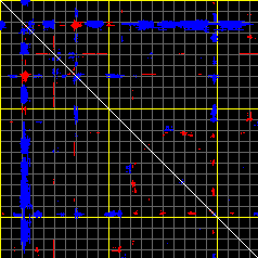 This matrix displays the maximum distance fluctuations between all pairs of CA atoms and between the two extreme conformations that were computed for this mode (DQMIN/DQMAX). Distance increases are plotted in blue and decreases in red for the strongest 10% of the residue pair distance changes. Every pixel corresponds to a single residue. Grey lines are drawn every 10 residues, yellow lines every 100 residues (counting from the upper left corner).