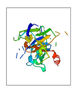 These views are prepared from three orthologuous viewpoints with MolScript. Secondary structures are determined from the C-alpha atom positions of your protein (N-terminal blue, C-terminal red).