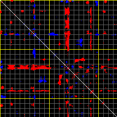 This matrix displays the maximum distance fluctuations between all pairs of CA atoms and between the two extreme conformations that were computed for this mode (DQMIN/DQMAX). Distance increases are plotted in blue and decreases in red for the strongest 10% of the residue pair distance changes. Every pixel corresponds to a single residue. Grey lines are drawn every 10 residues, yellow lines every 100 residues (counting from the upper left corner).