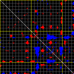 This matrix displays the maximum distance fluctuations between all pairs of CA atoms and between the two extreme conformations that were computed for this mode (DQMIN/DQMAX). Distance increases are plotted in blue and decreases in red for the strongest 10% of the residue pair distance changes. Every pixel corresponds to a single residue. Grey lines are drawn every 10 residues, yellow lines every 100 residues (counting from the upper left corner).