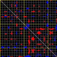This matrix displays the maximum distance fluctuations between all pairs of CA atoms and between the two extreme conformations that were computed for this mode (DQMIN/DQMAX). Distance increases are plotted in blue and decreases in red for the strongest 10% of the residue pair distance changes. Every pixel corresponds to a single residue. Grey lines are drawn every 10 residues, yellow lines every 100 residues (counting from the upper left corner).