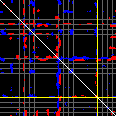 This matrix displays the maximum distance fluctuations between all pairs of CA atoms and between the two extreme conformations that were computed for this mode (DQMIN/DQMAX). Distance increases are plotted in blue and decreases in red for the strongest 10% of the residue pair distance changes. Every pixel corresponds to a single residue. Grey lines are drawn every 10 residues, yellow lines every 100 residues (counting from the upper left corner).