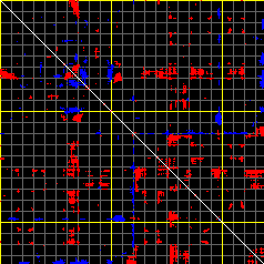 This matrix displays the maximum distance fluctuations between all pairs of CA atoms and between the two extreme conformations that were computed for this mode (DQMIN/DQMAX). Distance increases are plotted in blue and decreases in red for the strongest 10% of the residue pair distance changes. Every pixel corresponds to a single residue. Grey lines are drawn every 10 residues, yellow lines every 100 residues (counting from the upper left corner).