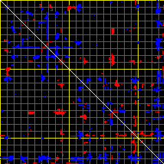 This matrix displays the maximum distance fluctuations between all pairs of CA atoms and between the two extreme conformations that were computed for this mode (DQMIN/DQMAX). Distance increases are plotted in blue and decreases in red for the strongest 10% of the residue pair distance changes. Every pixel corresponds to a single residue. Grey lines are drawn every 10 residues, yellow lines every 100 residues (counting from the upper left corner).