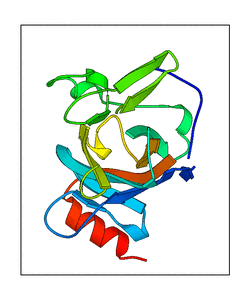 These views are prepared from three orthologuous viewpoints with MolScript. Secondary structures are determined from the C-alpha atom positions of your protein (N-terminal blue, C-terminal red).